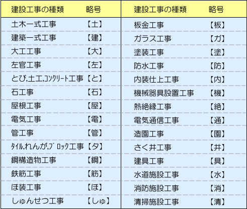 上記表中の【土木工事業】【建築工事業】【電気工事業】【管工事業】【鋼構造物工事業】【ほ装工事業】