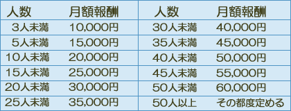 平澤社会保険労務士事務所 報酬規定労働基準法・労災保険・厚生年金などの事務の全てを任せていただく場合の月額報酬です。従業員の人数によって下記のとおり定められています。